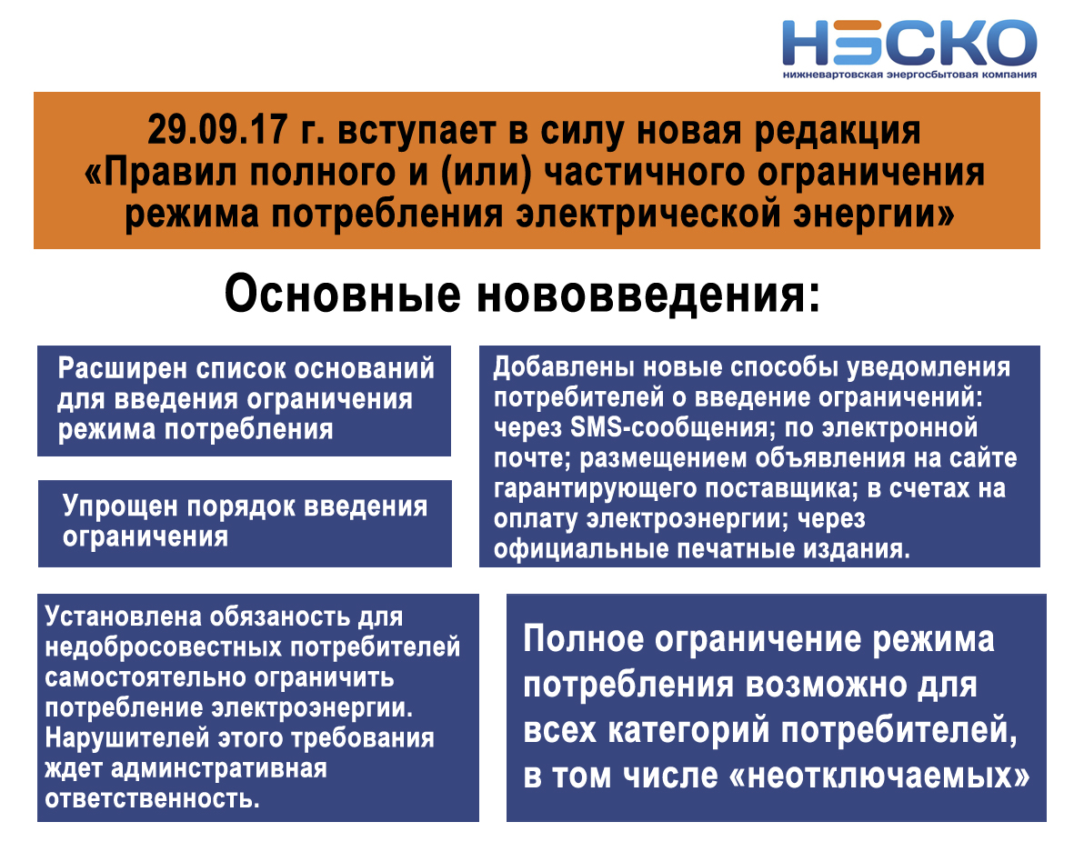 Нет, они будут касаться только юридических лиц. Стоит еще раз подчеркнуть, что под полное отключение электроэнергии теперь попадают и социальные объекты – медицинские учреждения, объекты централизованного водоснабжения и канализации, объекты связи, объекты воздушного, железнодорожного и водного транспорта, а также органы государственной власти и силовые ведомства. Поэтому «Нижневартовская Энергосбытовая компания» призывает своих потребителей очень ответственно отнестись к оплате счетов за электроэнергию, дабы избежать возможных неприятных ситуаций и негативных последствий.